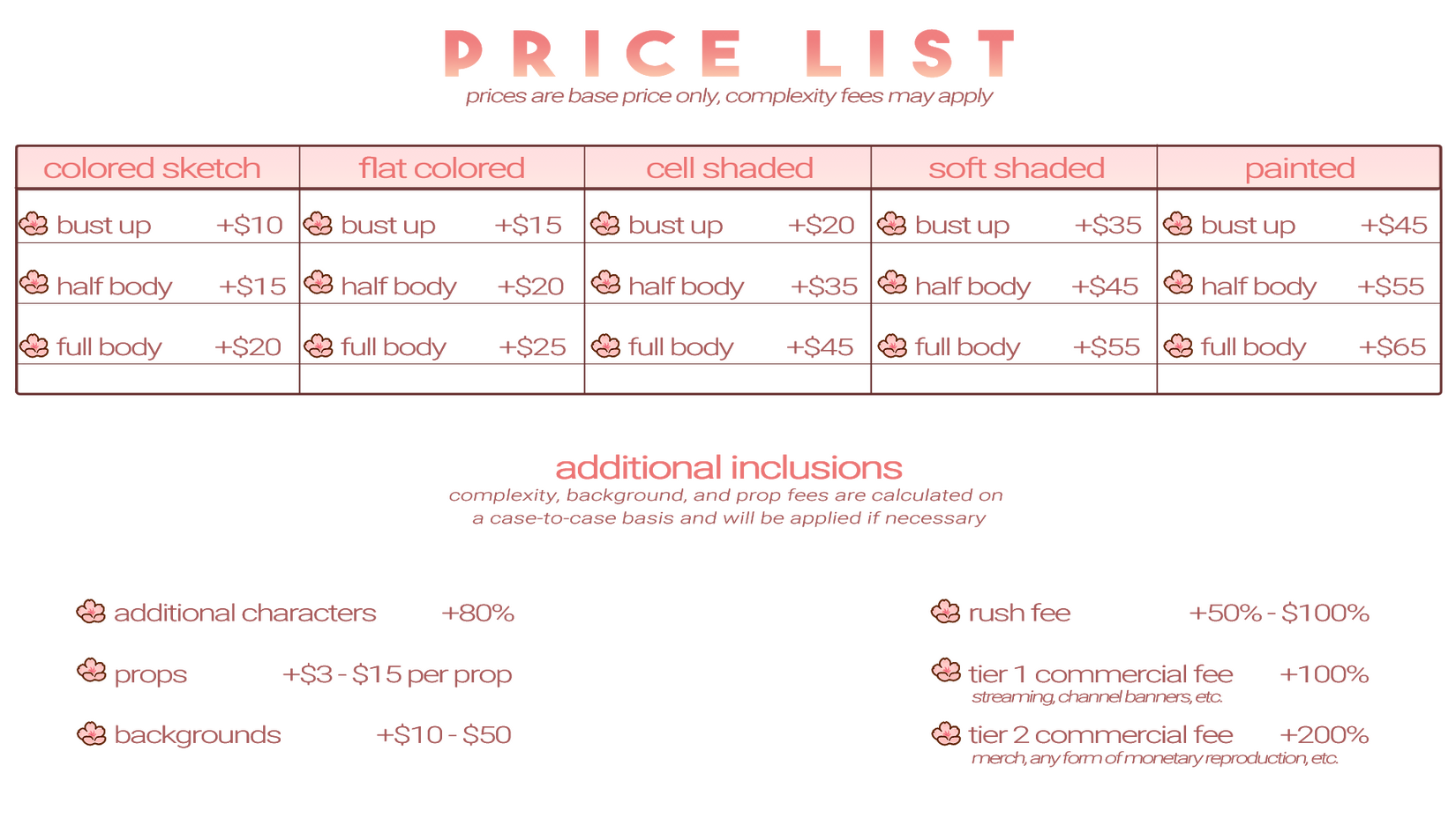 OTHER FEESadditional character: +75% for all rendering typesrush fee: +50%-100% of total priceprops: +3usd-15usd per propbackgrounds: +10usd-50usdbasic backgrounds are free!